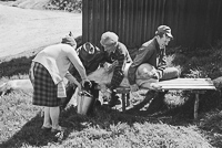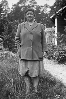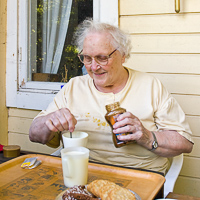 Britta Larsson dricker kaffe på verandan på Gevle Gård 14 juli 2005
