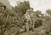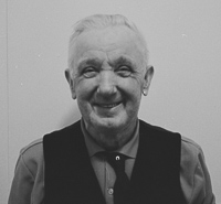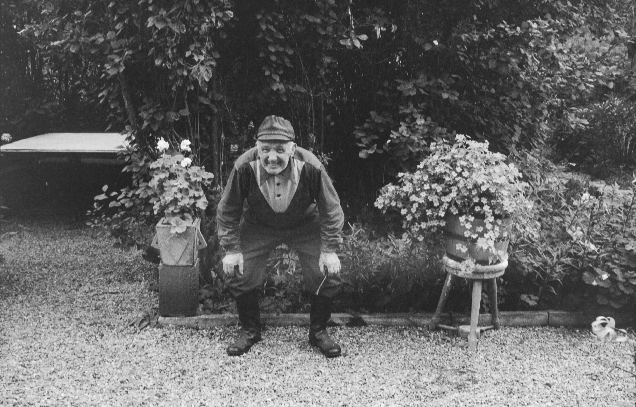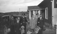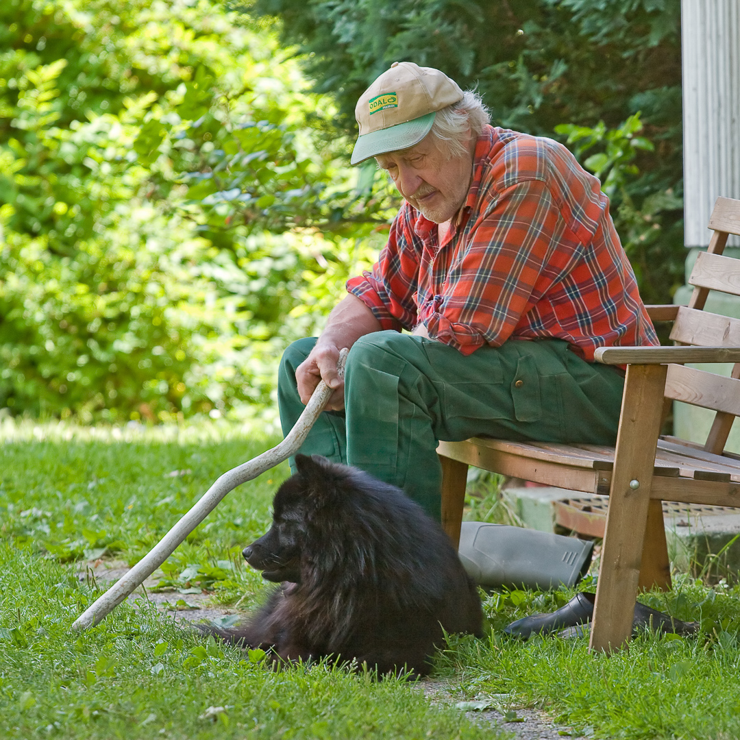 Ingvar Larsson och hunden Ludde utanför verandan på Gevle Gård 14 juli 2005