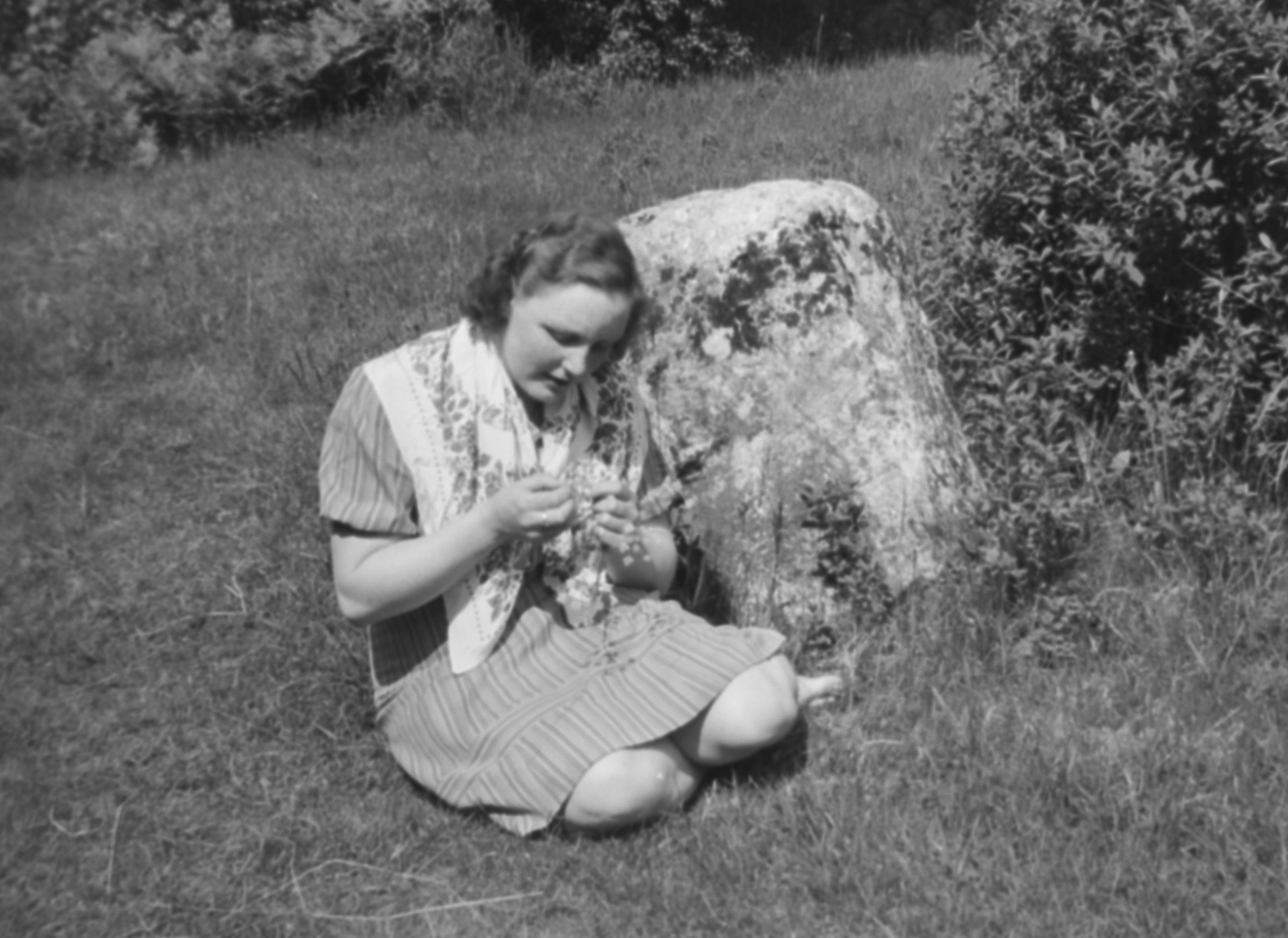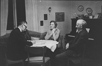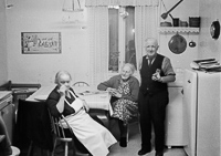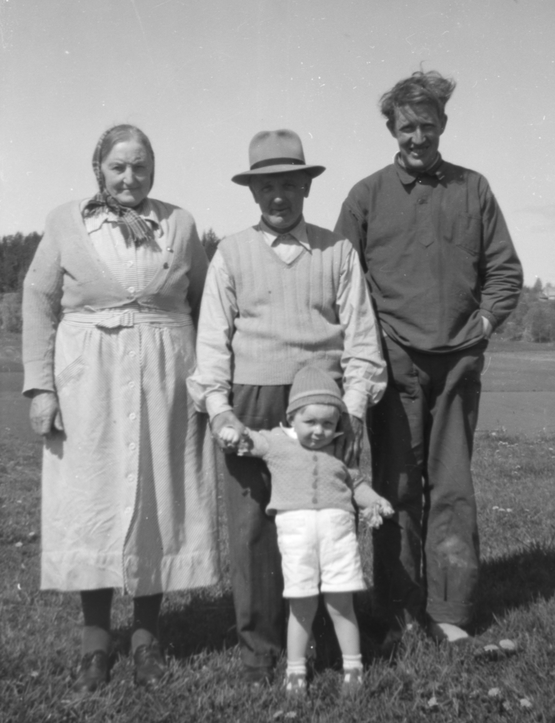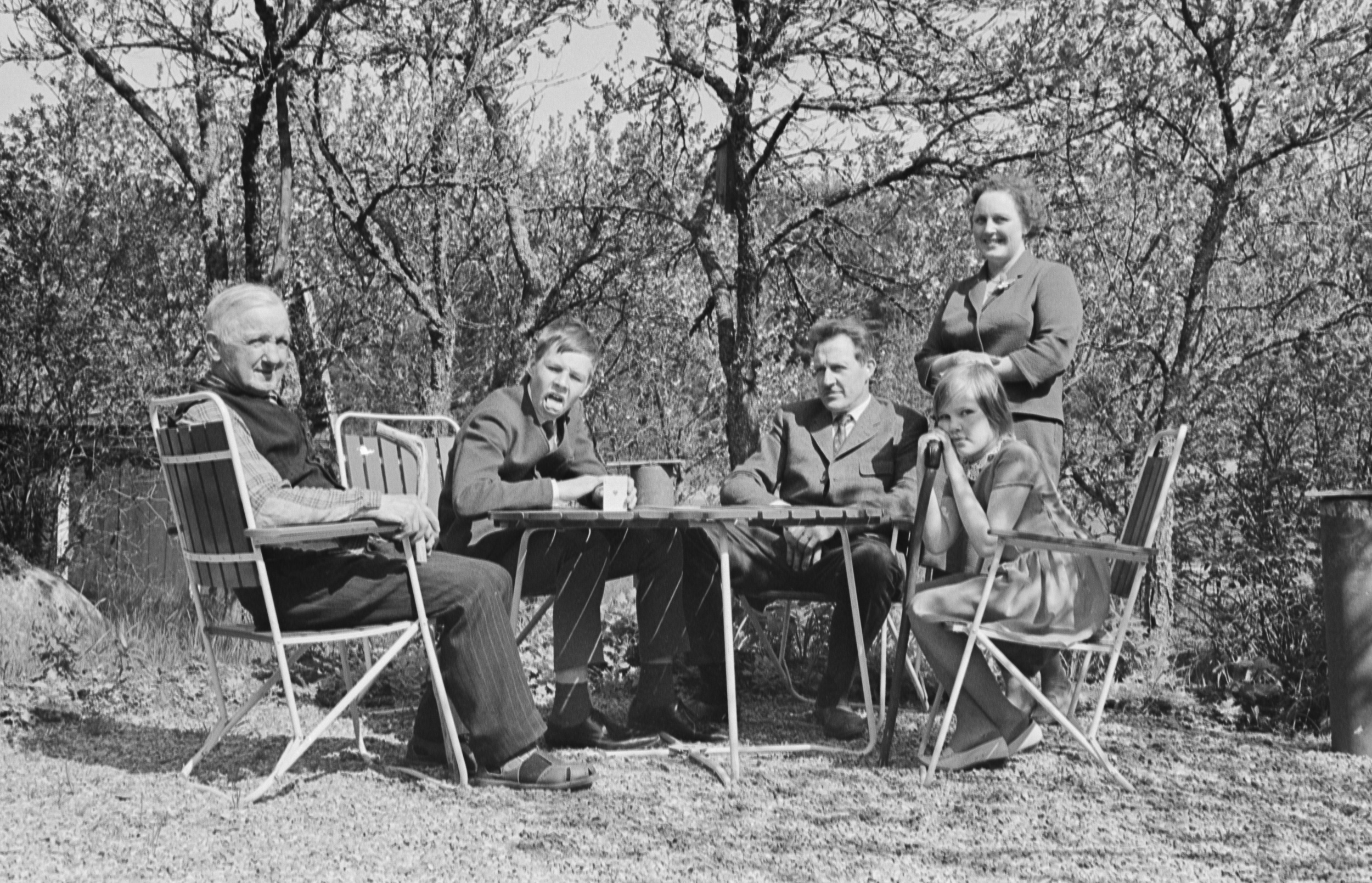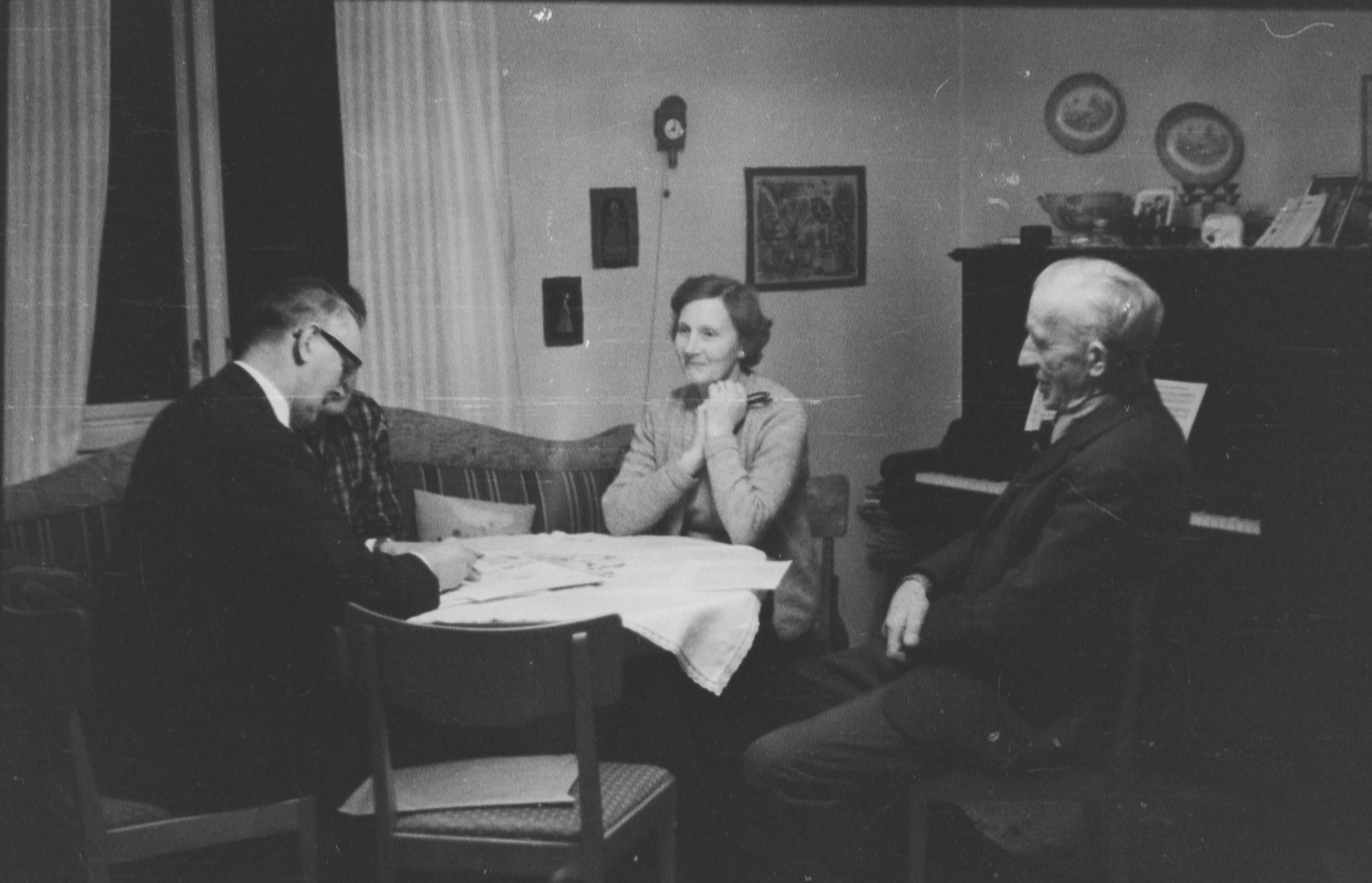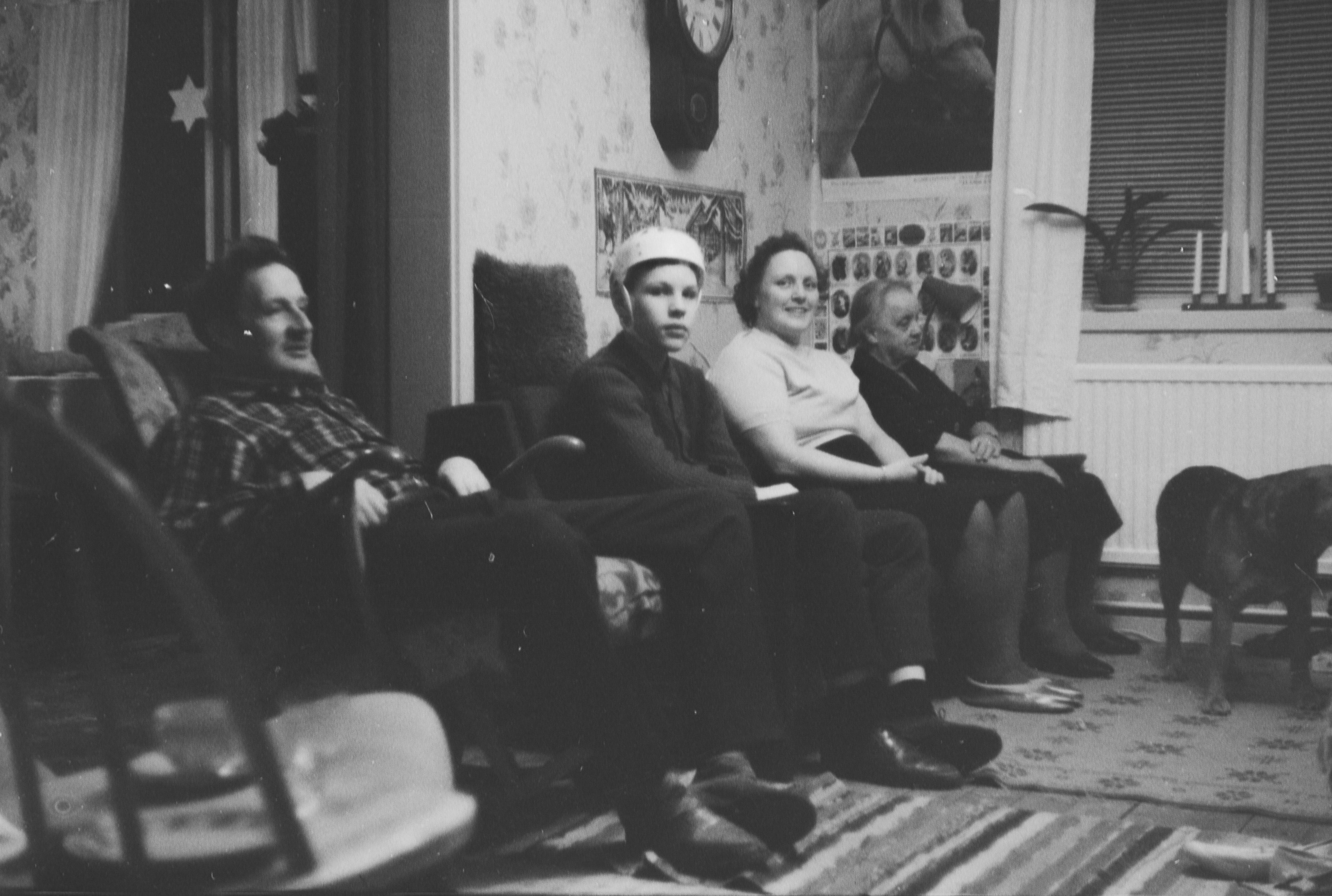 Ingvar, Lars Britta och Elin samt hunden Sessan tittar på TV i Hammarstugan
