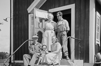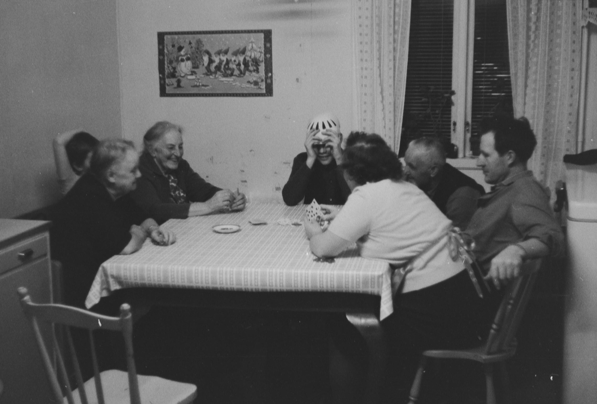Elin, Hulda, Lars, Britta, Emil och Ingvar spelar kort i köket på Hammarstugan