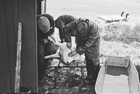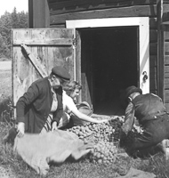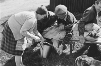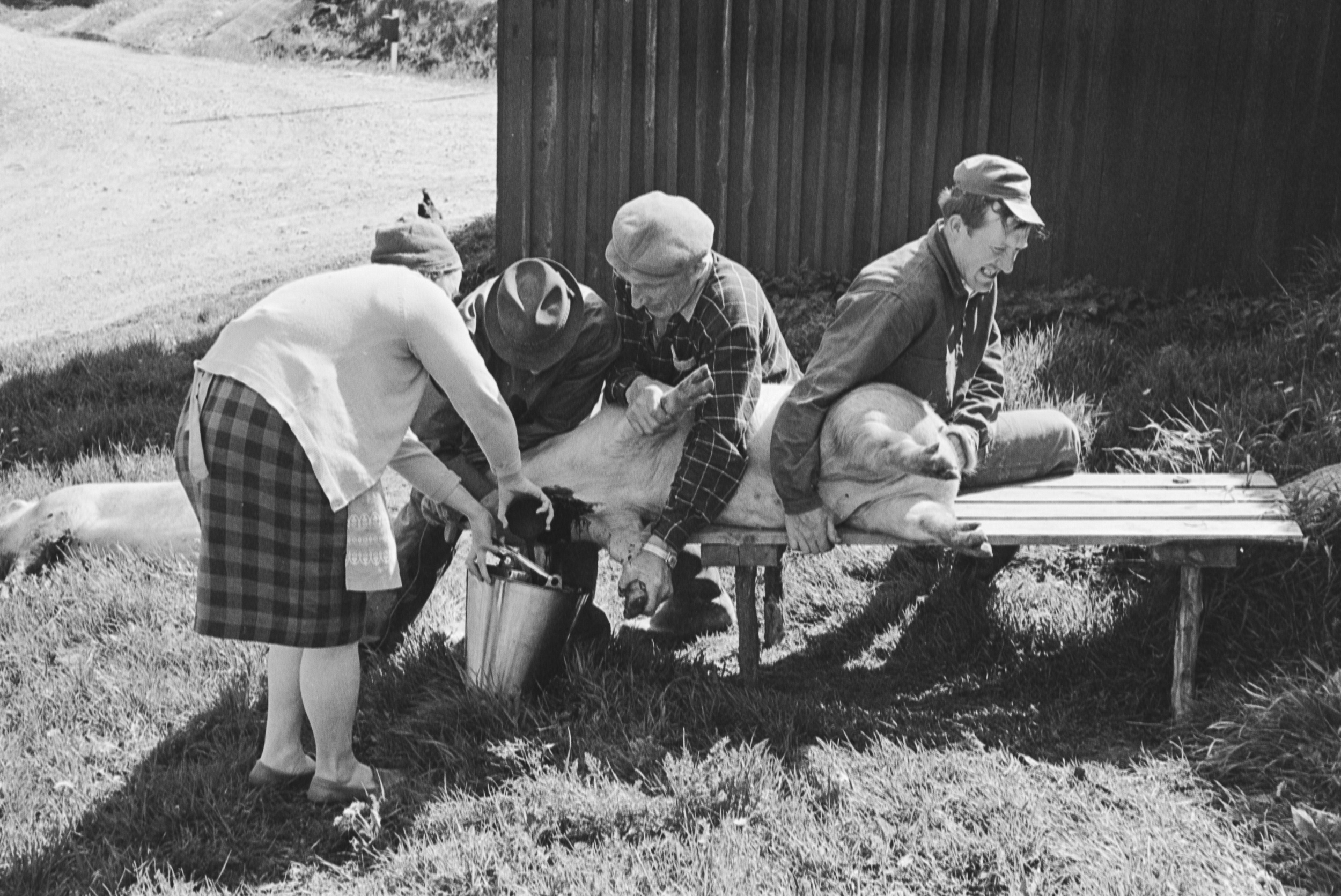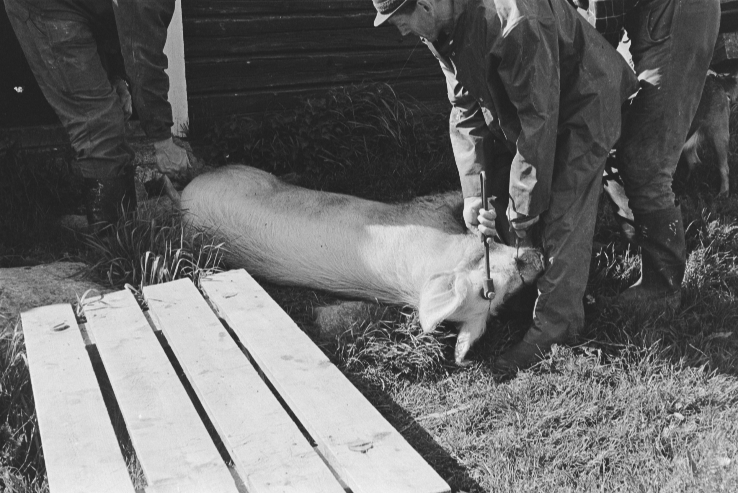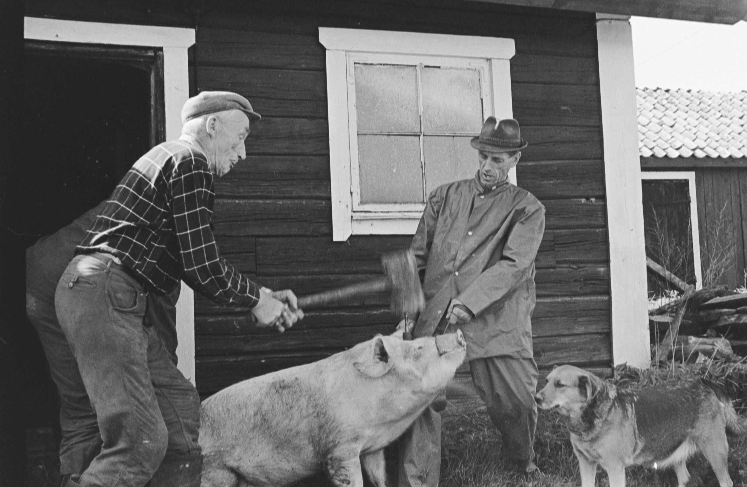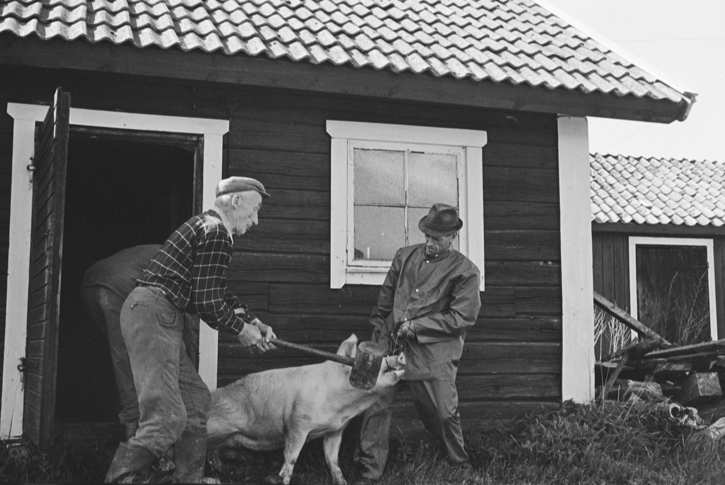 Arvid, Kalle och Sessan ser på avlivning av okännd gris