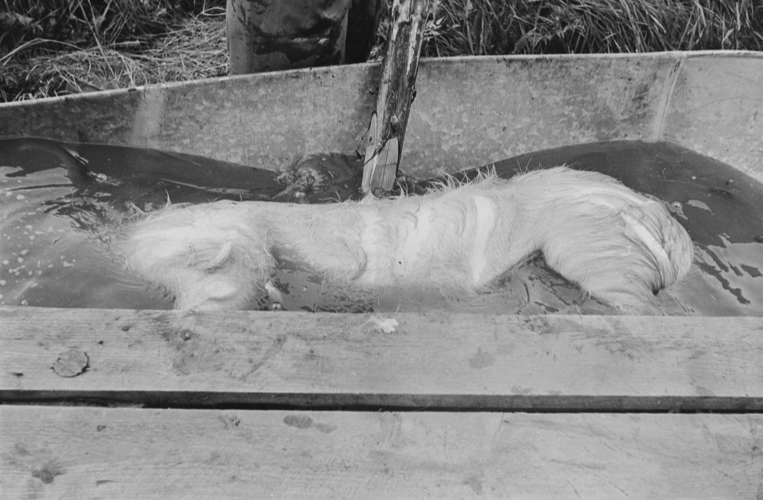 Grisen lögas i hett vatten för att håret skall gå lätt att skrapas bort