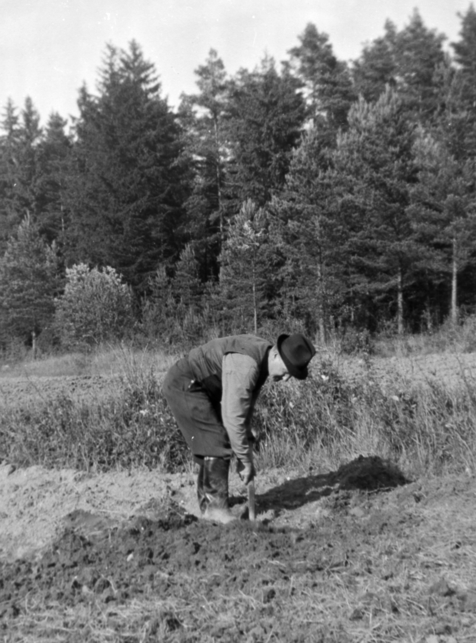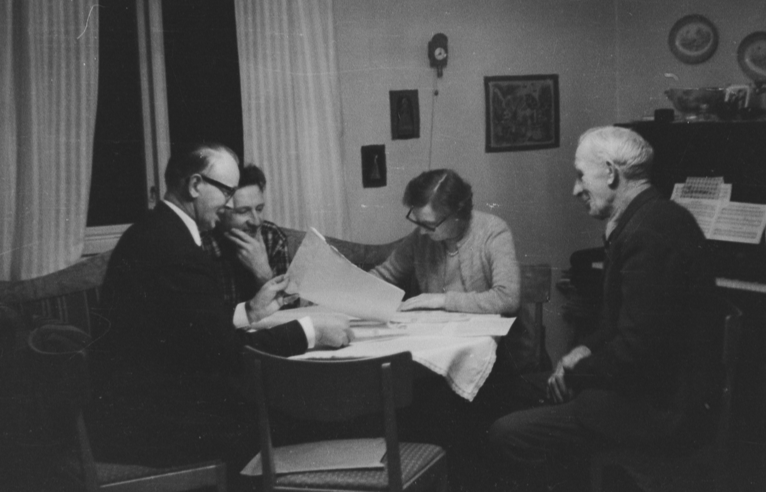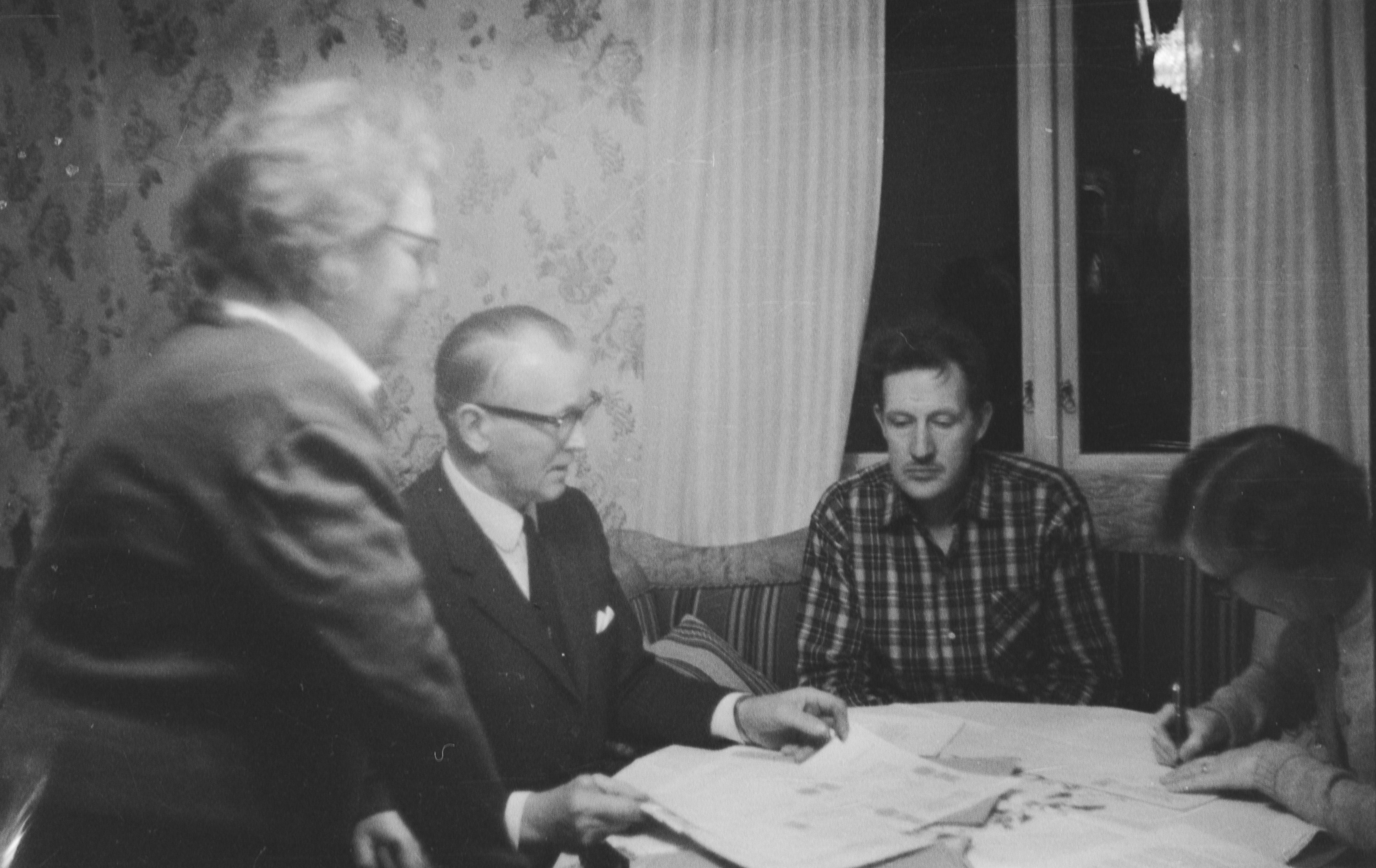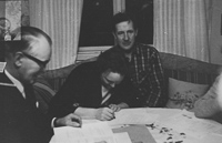 Ingvar skriver på papper för att bli ägare till Hammarstugan